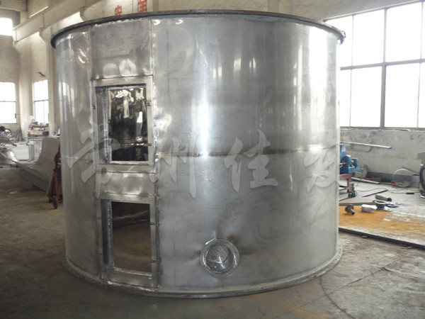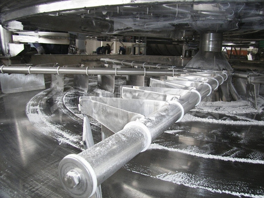 濕物料自加料器連續(xù)地加到干燥器上部第一層干燥盤上,帶有耙葉的耙臂做回轉(zhuǎn)運動使耙葉連續(xù)地翻抄物料。物料沿指數(shù)螺旋線流過干燥盤表面,在小干燥盤上的物料被移送到外緣,并在外緣落到下方的大干燥盤外緣,在大干燥盤上物料向里移動并從中間落料口落入下一層小干燥盤中。大小干燥盤上下交替排列,物料得以連續(xù)地流過整個干燥器。中間的干燥盤內(nèi)通入加熱介質(zhì),加熱介質(zhì)形式有飽和蒸汽、熱水和導熱油,加熱介質(zhì)由干燥盤的一端進入,從另一端導出。已干物料從最后一層干燥盤落到殼體的底層,最后被耙葉移送到出料口排出。濕份從物料中溢出,由設在頂蓋上的排濕口排出,真空型盤式干燥器的濕氣由設在頂蓋上的真空泵口抽出。從底層排出的干物料可直接包裝。通過配備翅片加熱器、溶劑回收冷凝器、布袋除塵器、干料返混機構、引風機等輔機,可提高其干燥的生產(chǎn)能力,干燥膏糊狀和熱敏性物料,可方便地回收溶劑,并能進行熱解和反應操作。